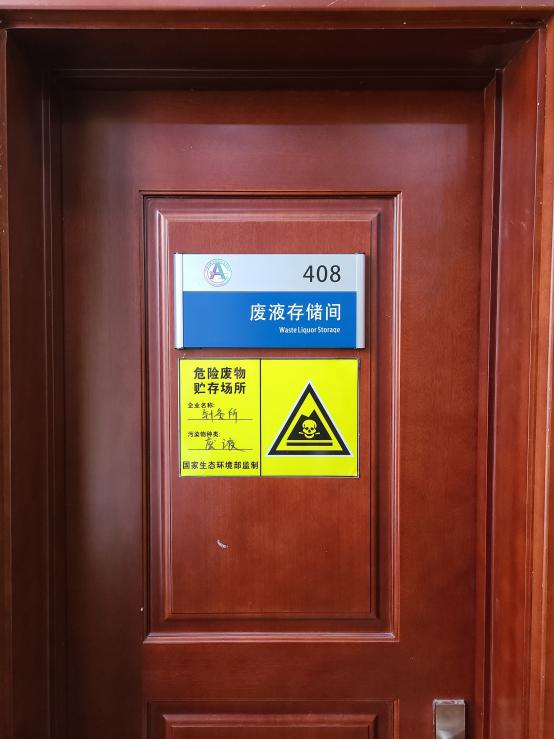 我所实验室废液主要有害成分为甲醛,产生量较少,其危废贮存场所为408废液存储间,并在门上贴有黄色危险品贮存场所标识,危废品的包装密封,为防止液体渗漏专门配置方渗漏托盘,并由资产设备管理处定期及时在固体废物综合管理系统提出处理申请并主动联系相关处理公司。